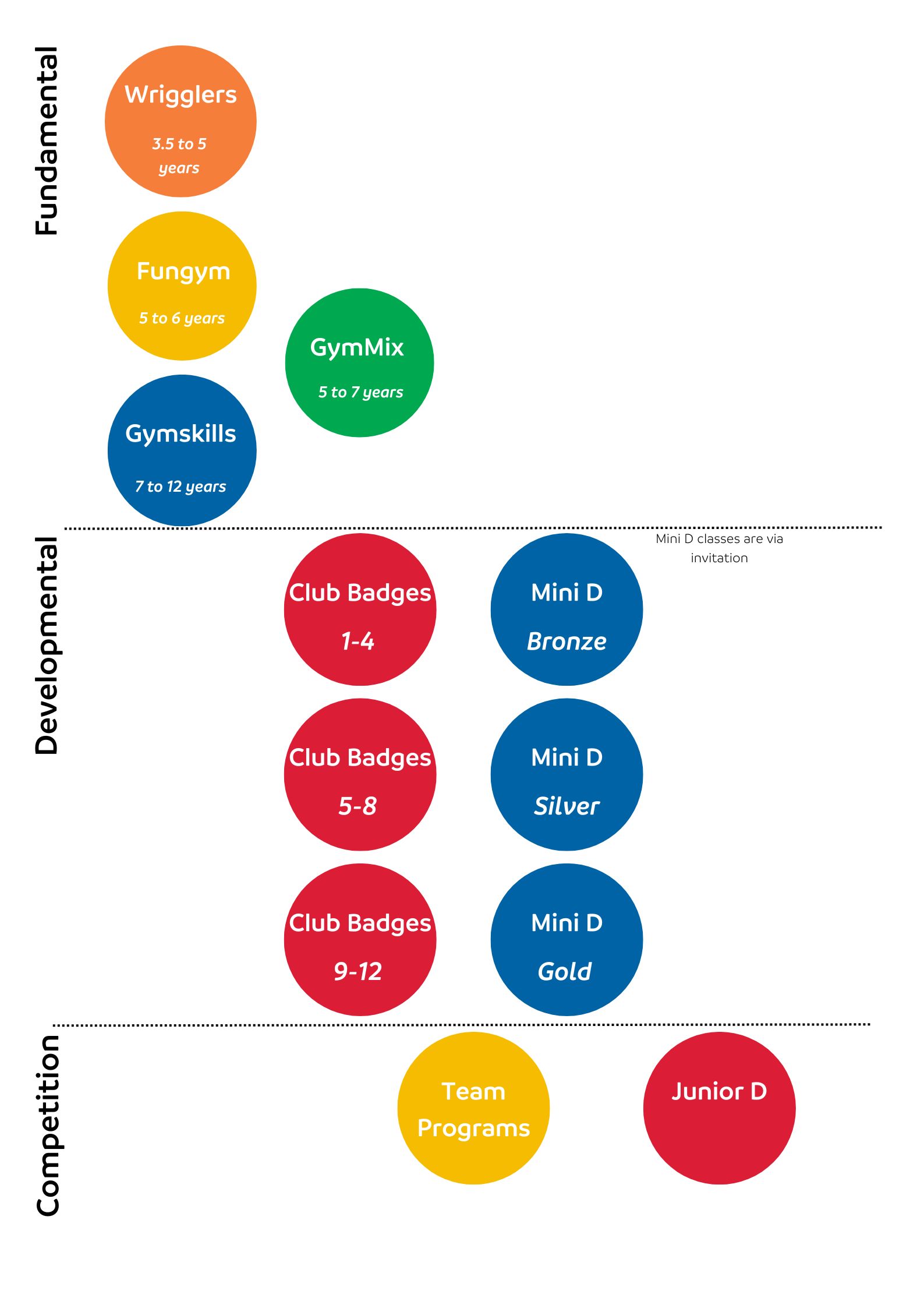 Gymnasts will need to commit to the full amount of training days/hours to progress in the Mini D Program. Alternatively, your child can continue in their current class or move across into an alternative program.